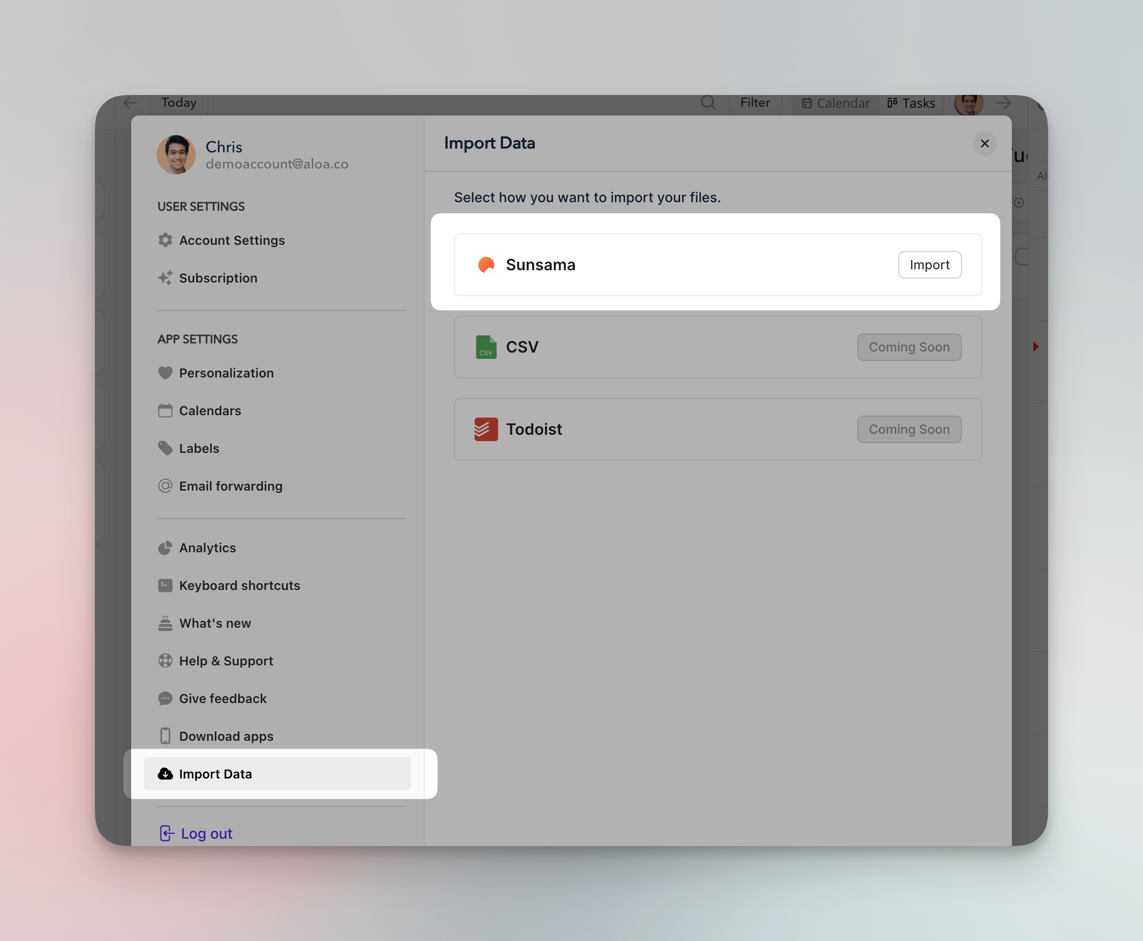 If you are a Sunsama user, Ellie allows you to migrate your existing data via the Sunsama CSV import -> Ellie import tab on the settings page