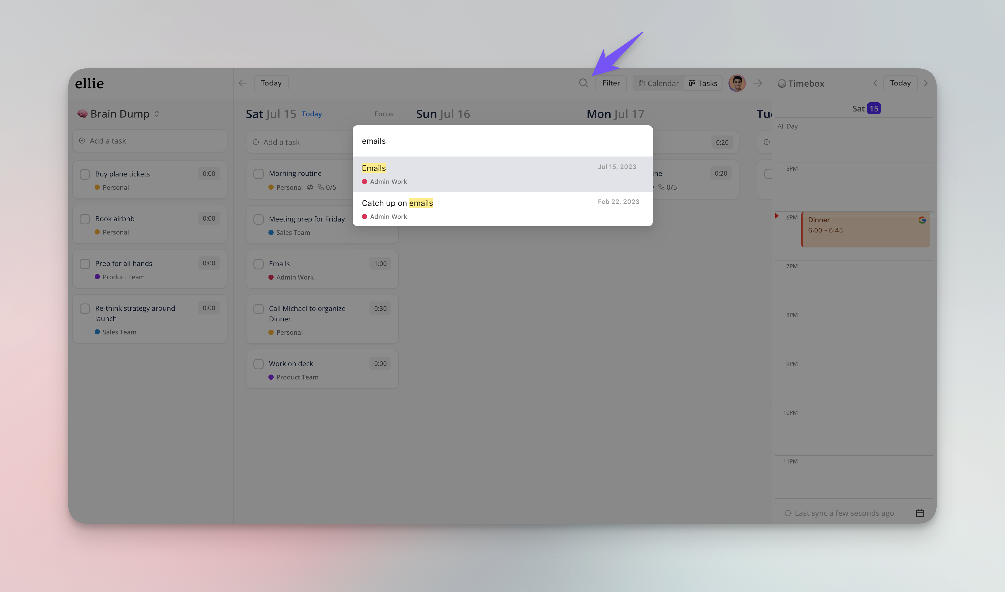 You can search for any tasks in Ellie by clicking the Search icon in the top bar (or with the keyboard shortcut CMD+K or CTRL+K)